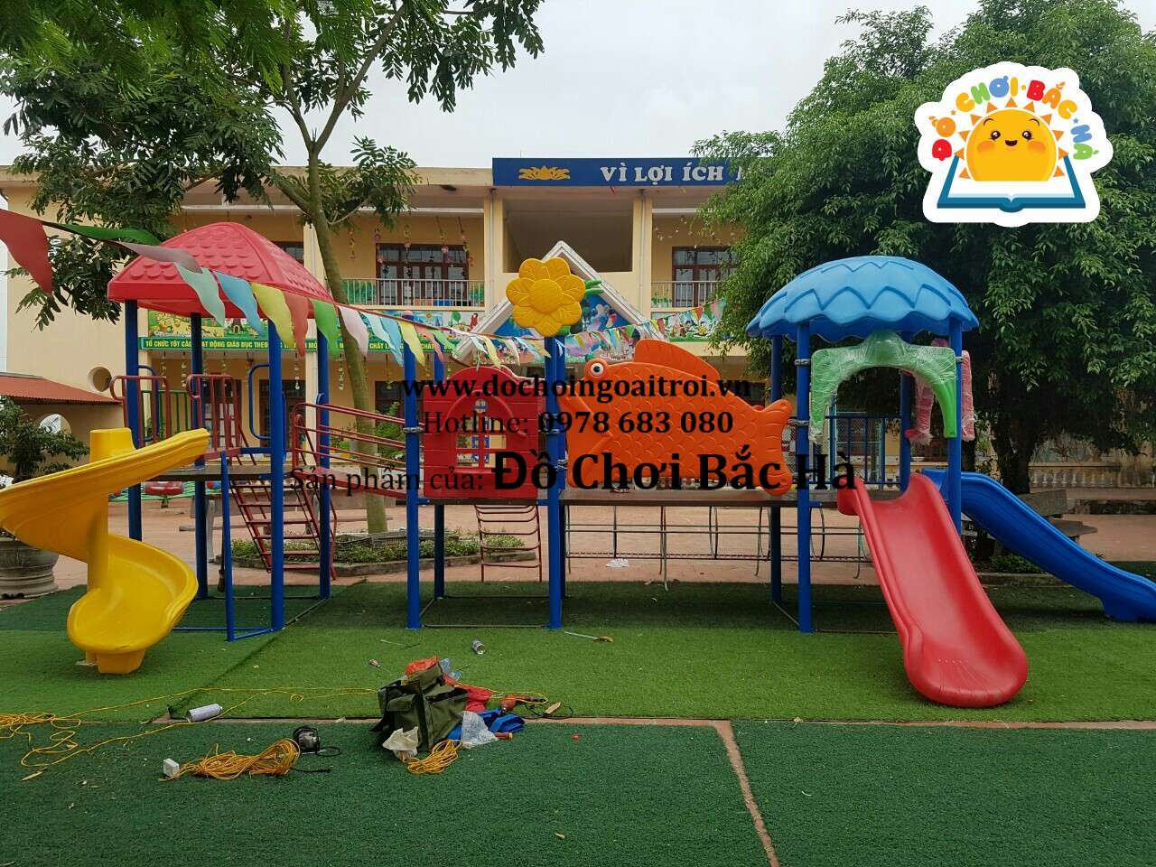 3 khối nhà, 1 mái vuông,1 mái nhà hình tròn giả lá, 5 cung vách phù điêu, 1 cầu trượt thẳng đơn, 1 cầu trượt thẳng đôi, 1 cầu trượt ống, 1 trang trí hình hoa, cùng hệ thống vành đai , lan can bảo vệ được bố trí hợp lý.