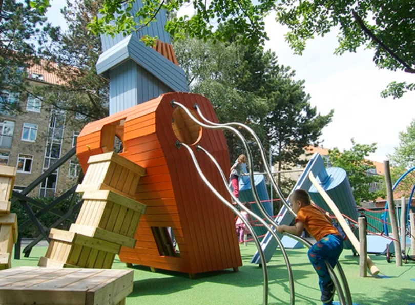 - Mô tả tổng quan: Được xây dựng bởi công ty thiết kế Monstrum, các sân chơi tại Đan Mạch nổi bật với các công trình hình dạng độc đáo như lâu đài, tàu vũ trụ, côn trùng khổng lồ.