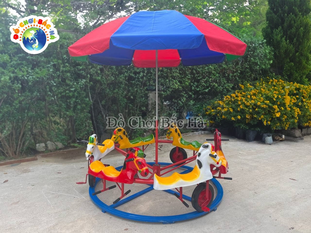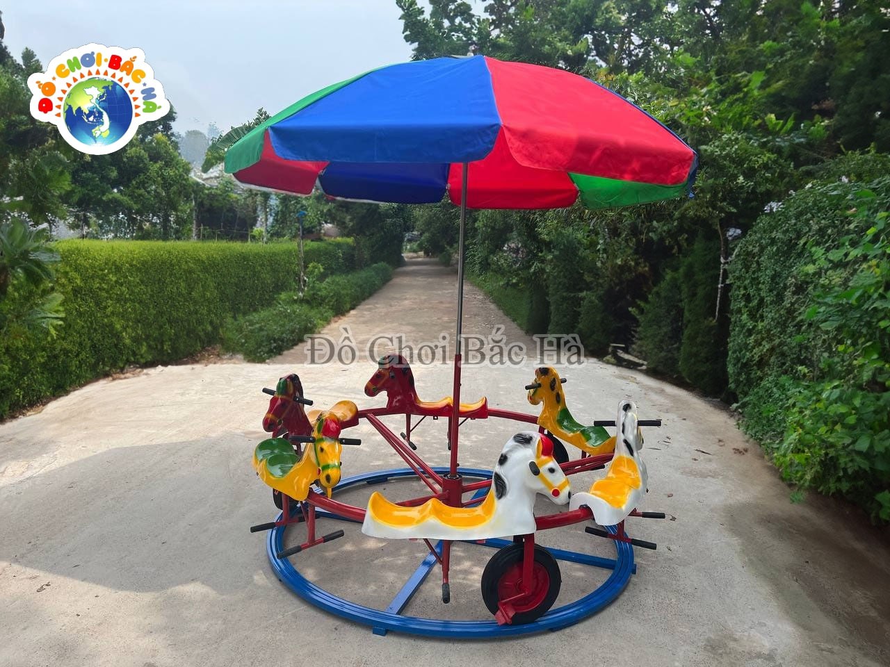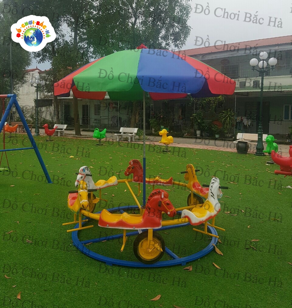 Ray và khung quay bằng thép ống. Có 12 chỗ ngồi hình các con giống bằng Composite, 3 bộ chuyền động, có dù che. |
