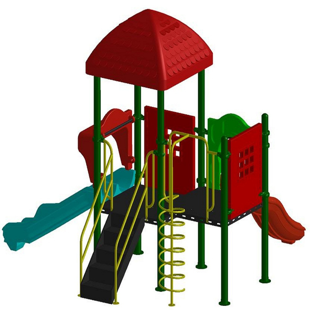 2 khối nhà, 1 mái vuông, 4 cung vách phù điêu, 1 cầu trượt thẳng đơn, 1 CẦU TRƯỢT THẲNG ĐÔI, 1 Bộ thể chất xoắn rột gà, 1 thang leo lên được bố trí hợp lý