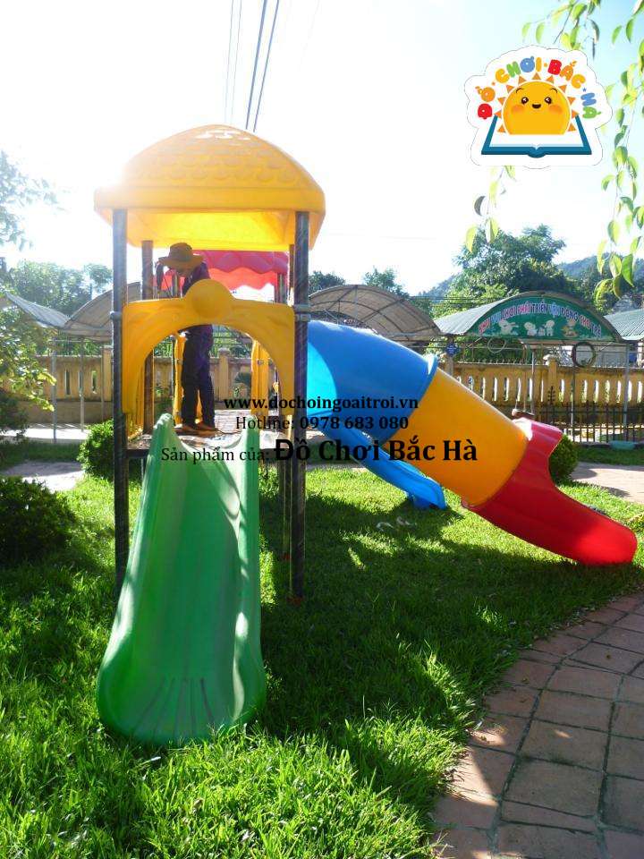 2 khối nhà, 1 mái vuông, 4 cung vách phù điêu, 1 cầu trượt thẳng đơn, 1 cầu trượt thẳng đôi, 1 ống chui, 1 Bộ thể chất xoắn rột gà, 1 thang leo lên được bố trí hợp lý