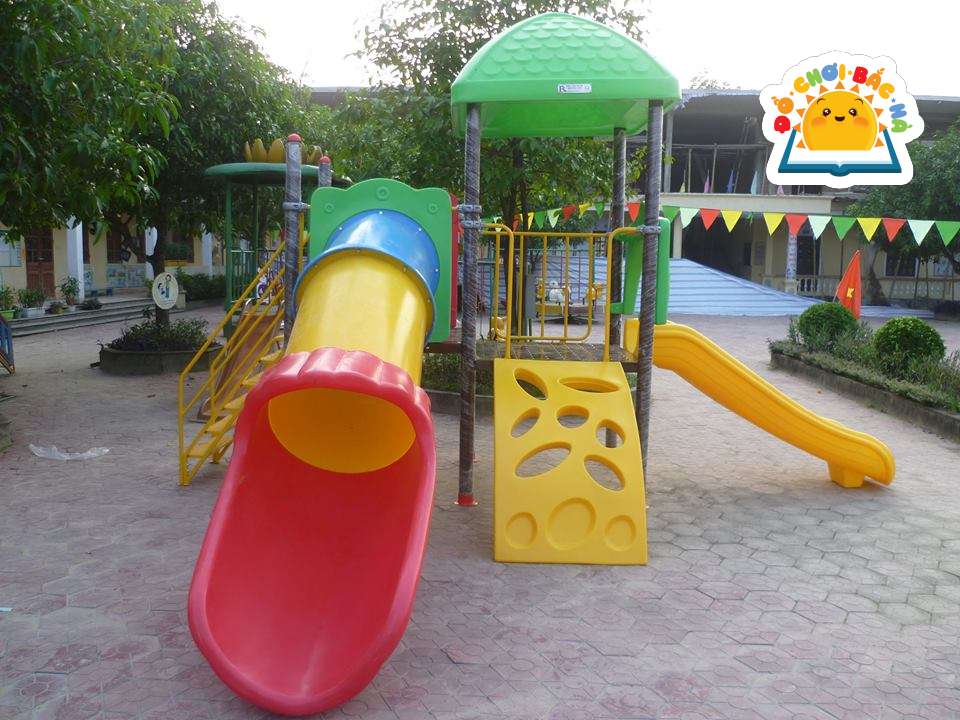 3khối nhà, 1 mái vuông,1 mái tròn hình lá, 5 cung vách phù điêu, 1 cầu trượt thẳng đơn, 1 cầu trượt xoắn,1 cầu trượt thẳng đôi, 1 thang leo lên 1thang bò sắt được bố trí hợp lý