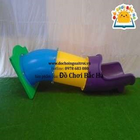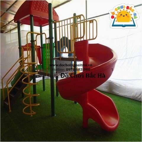 3 khối nhà, 1 mái vuông,6 cung vách phù điêu, 2 cầu trượt thẳng đơn, 1 bộ thể chất con lắc nhựa, 1 thang bò nhựa,thang leo lên được bố trí hợp lý