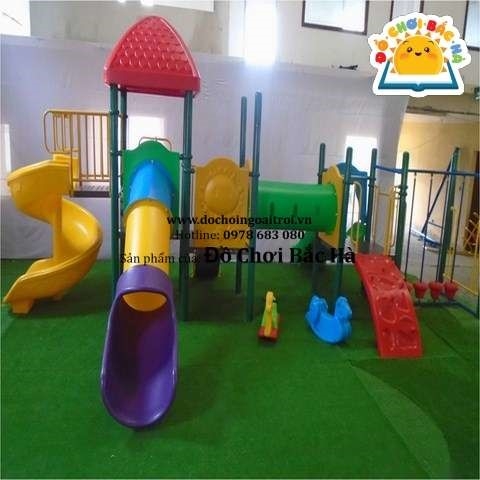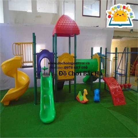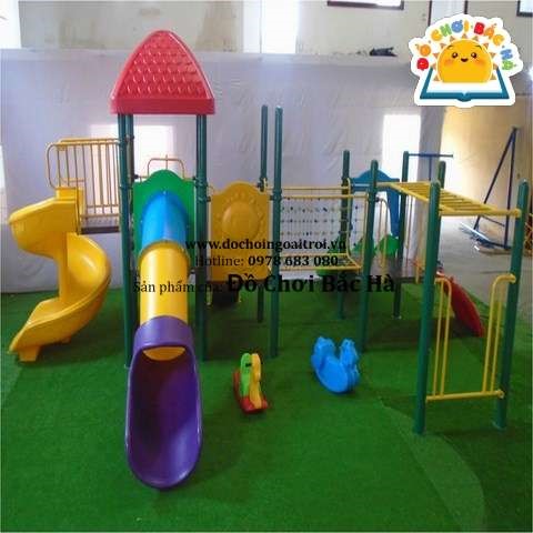 3 khối nhà, 1 mái vuông,6 cung vách phù điêu, 1 cầu trượt thẳng đơn, 1 bộ thể chất con lắc nhựa, 1 thang bò nhựa, 1 cầu trượt xoắn, 1 cầu trượt ống, 1 ống chui, thang leo lên được bố trí hợp lý