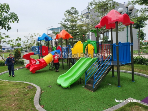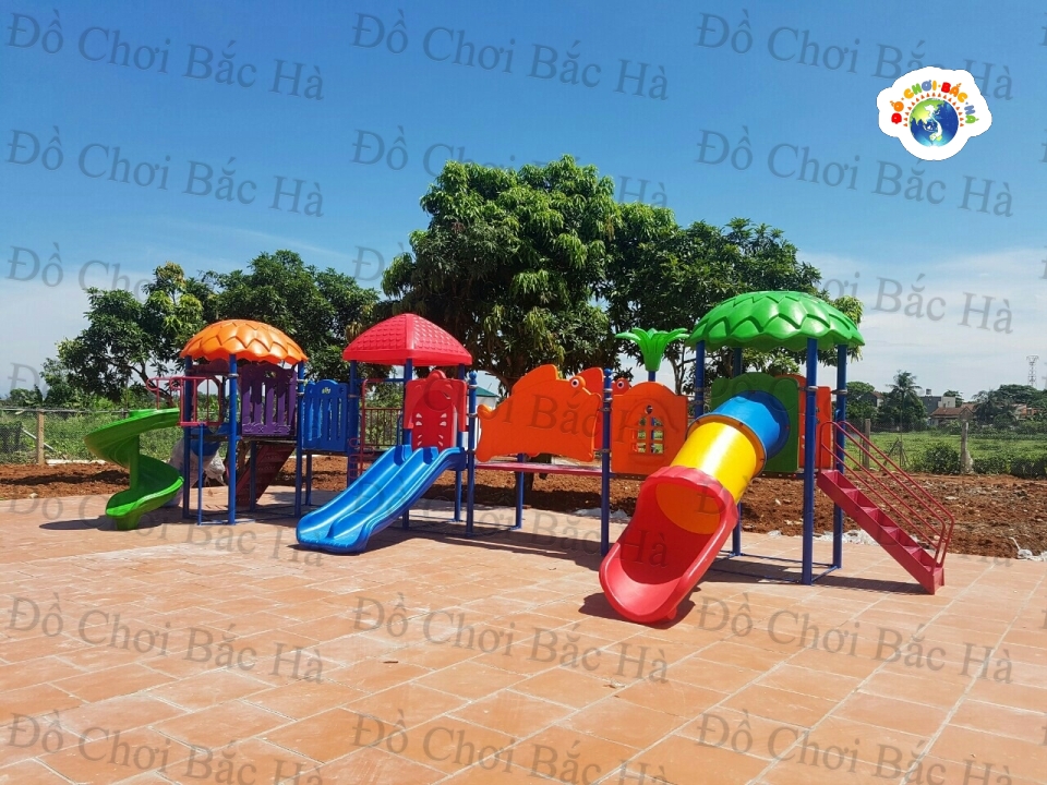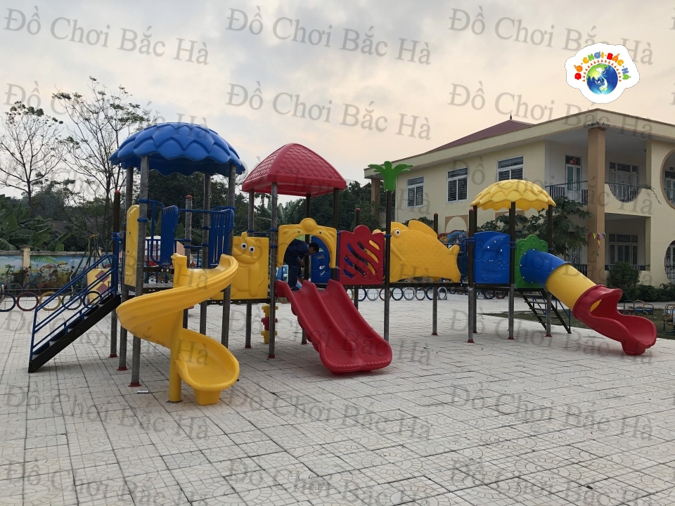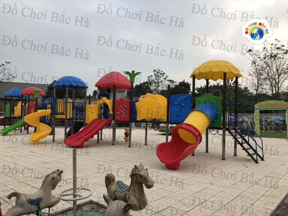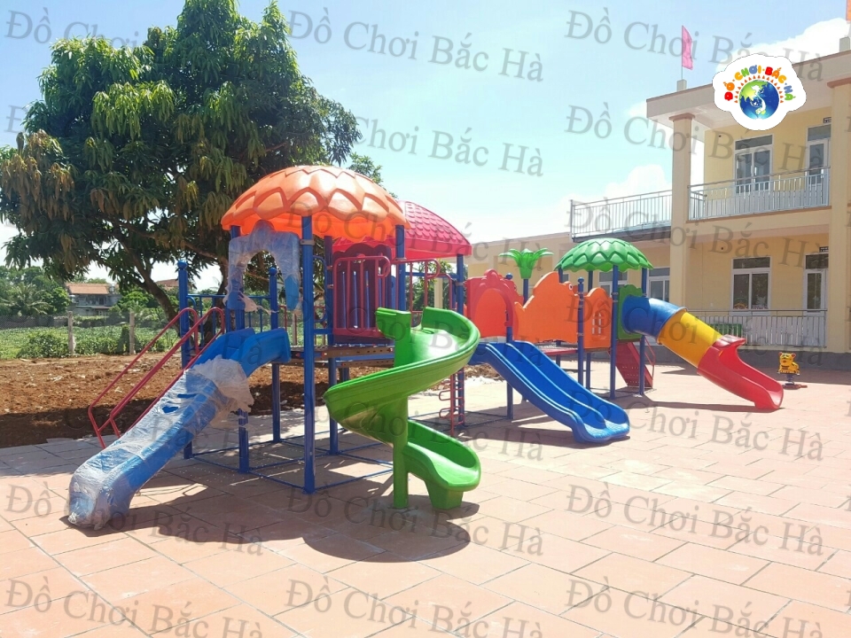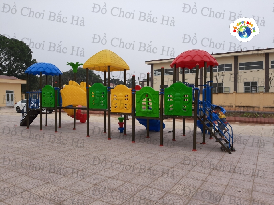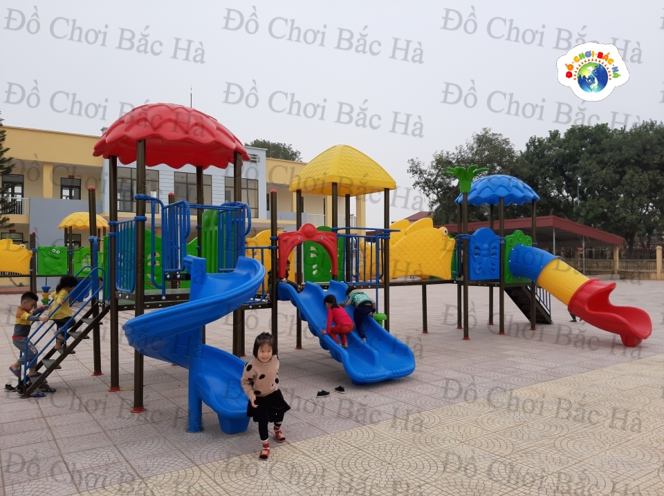 7 khối nhà, 1 mái vuông,2 mái tròn hình lá, 8 cung vách phù điêu,1 cầu trượt thẳng đôi, 1 cầu trượt xoắn,1 cầu trượt ống 1 trang trí hình hoa,1 bộ thể chất con lắc nhựa, cùng hệ thống vành đai , lan can bảo vệ được bố trí hợp lý