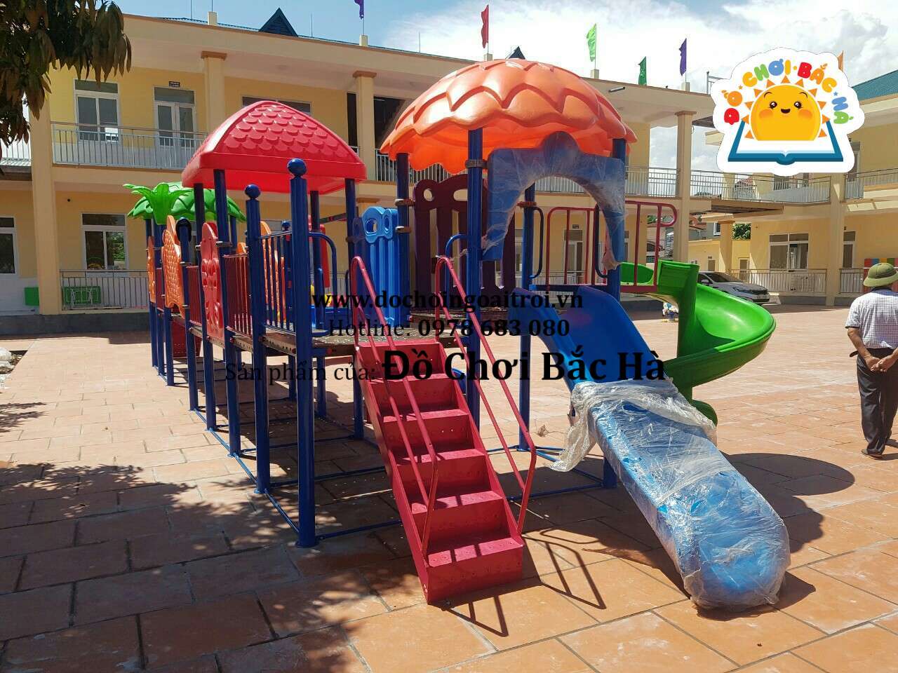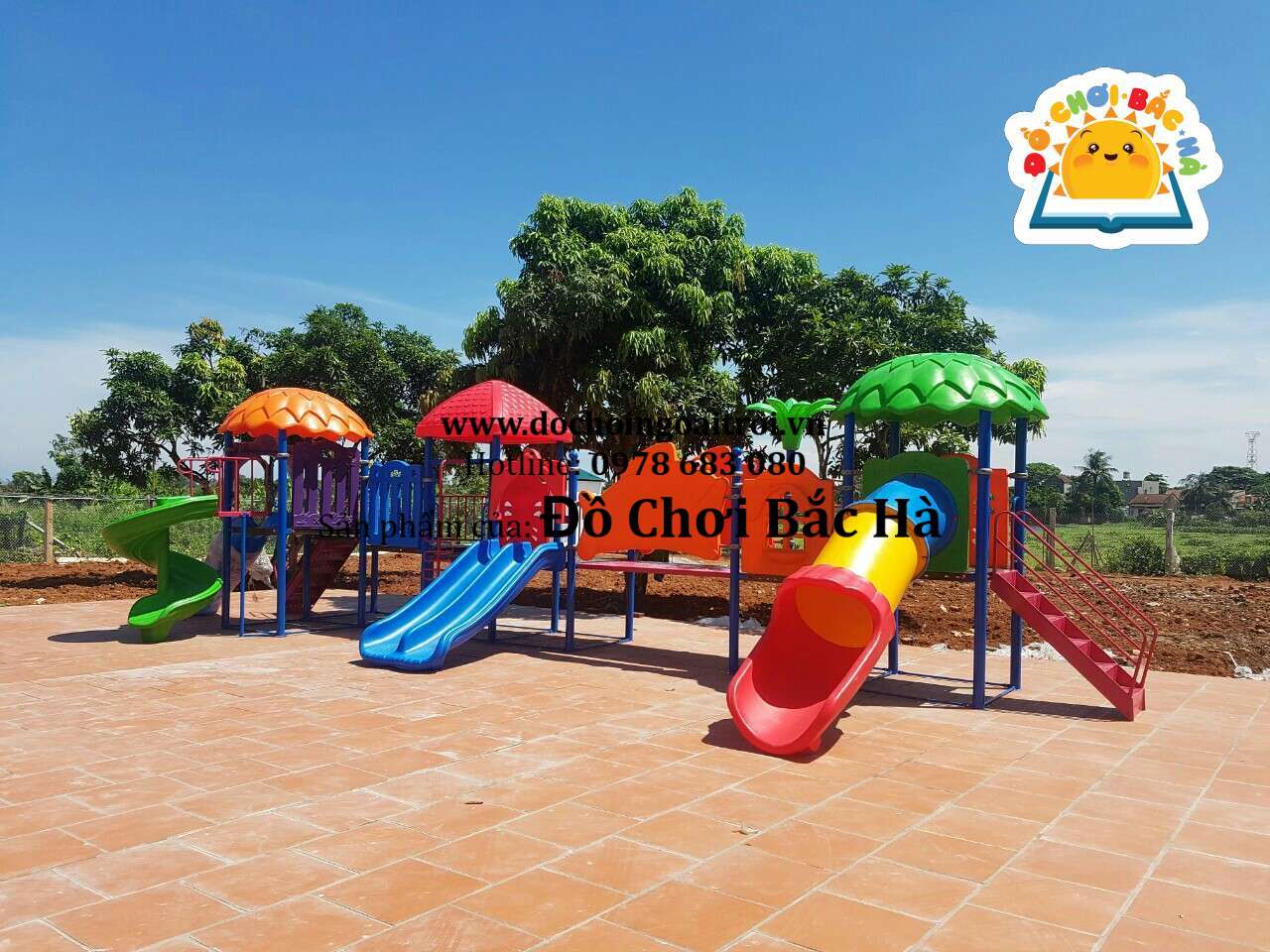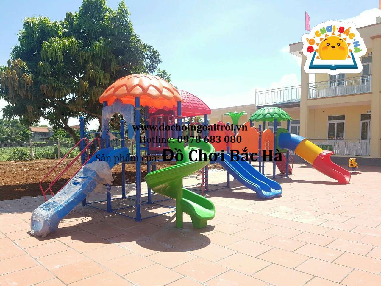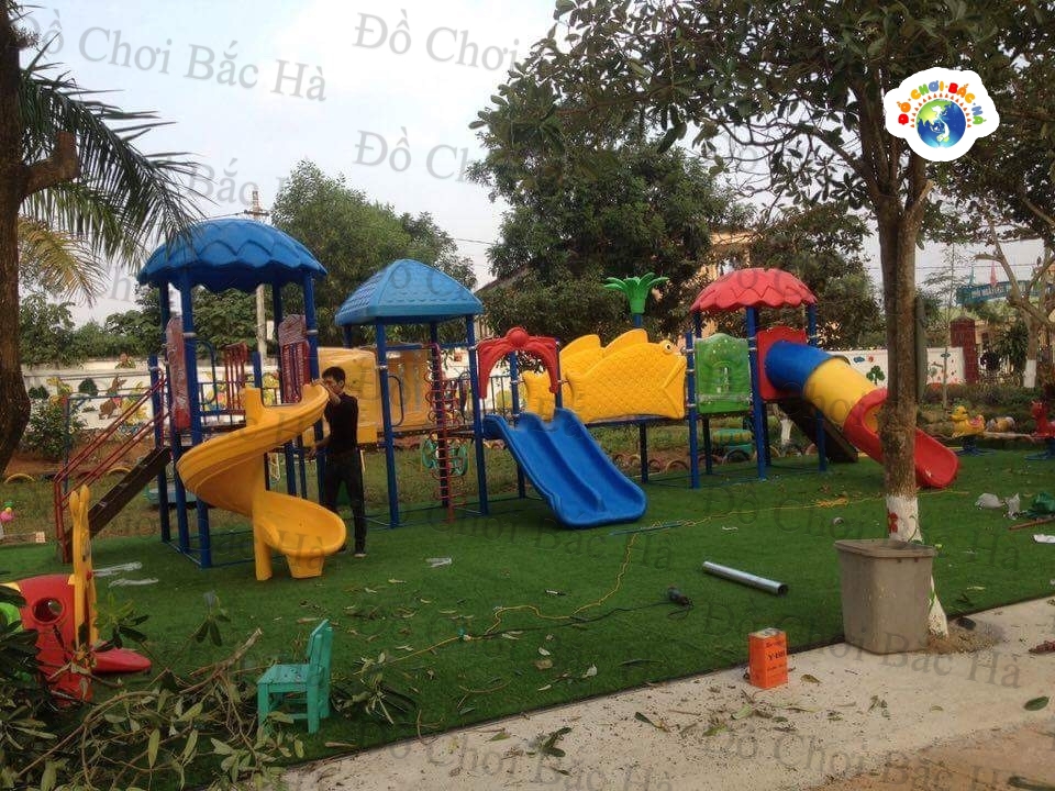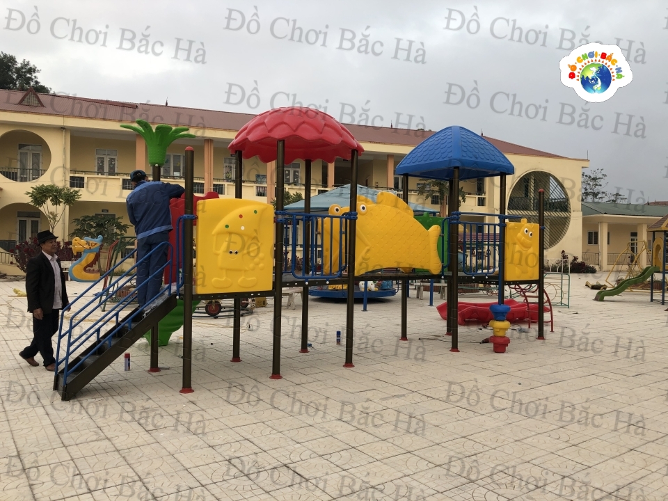 7 khối nhà, 1 mái vuông,2 mái tròn hình lá, 8 cung vách phù điêu,1 cầu trượt thẳng đôi, 1 cầu trượt xoắn,1 cầu trượt ống 1 trang trí hình hoa,1 bộ thể chất con lắc nhựa, cùng hệ thống vành đai , lan can bảo vệ được bố trí hợp lý