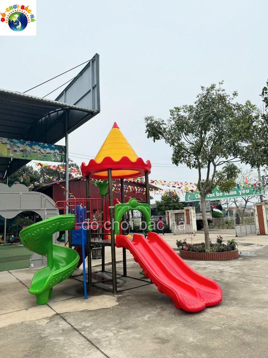 Cầu trượt xoắn: Là cầu trượt dạng xoắn ốc có trụ sắt dày bên trong và được bắt vít xuống nền bê tông chắc chắn đảm bảo không sê dịch khi trẻ chơi. Chiều cao từ mặt đất lên sàn là 1,4 m .