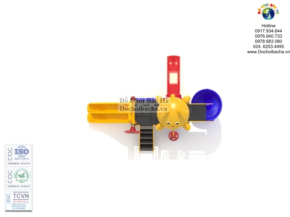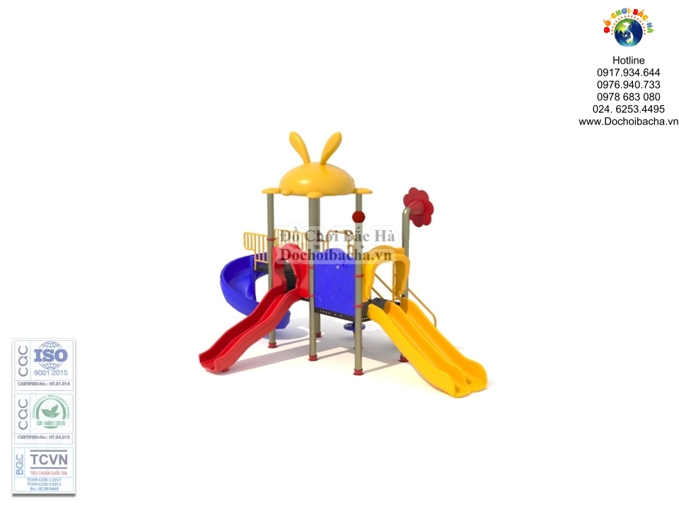 Cầu trượt xoắn: Là cầu trượt dạng xoắn ốc có trụ sắt dày bên trong và được bắt vít xuống nền bê tông chắc chắn đảm bảo không sê dịch khi trẻ chơi. Chiều cao từ mặt đất lên sàn là 1,4 m .