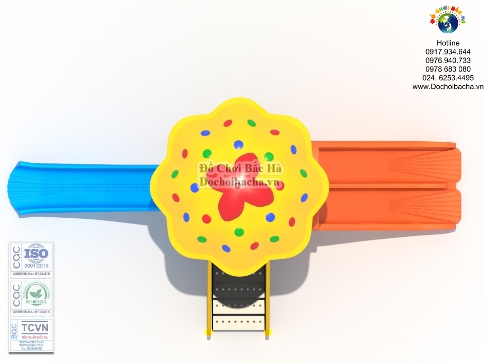 Cầu trượt xoắn: Là cầu trượt dạng xoắn ốc có trụ sắt dày bên trong và được bắt vít xuống nền bê tông chắc chắn đảm bảo không sê dịch khi trẻ chơi. Chiều cao từ mặt đất lên sàn là 1,4 m .